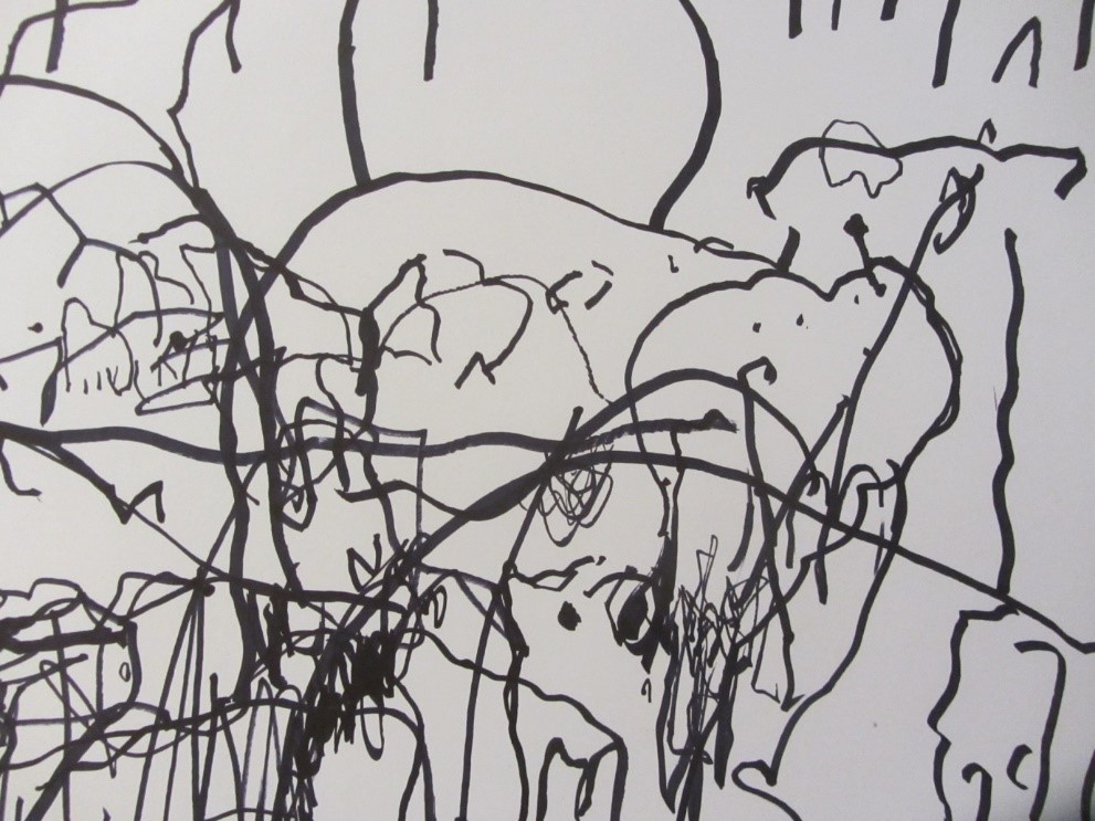 ‘Flock Together’ was co-conceived by artists Sara Dudman and Debbie Locke, working together in collaboration from 2013- 2016. Together they created a series of paintings and drawings which explore the interface between machine and hand-made marks, whilst attempting to capture and represent the complex and interdependent working relationship between a Blackdown Hills sheep farmer, his dog and his sheep. Using innovative technology, including webcams and GPS, combined with more traditional mediums, the artists worked in alternating layers, incorporating painterly gestures interwoven with precise, machine-made lines, to simultaneously reveal and obliterate the depicted movements of sheep. Though, seemingly chaotic, there is order within these turbulent scenes – patterns emerge, linking the whereabouts of the flock to the activity of the farmer and the dog. This continuous dialogue between visual coherence and the conceptual basis for the work became a central focus, driving this collaborative layering process – whilst allowing the work to remain rooted in landscape traditions and the documentation of traditional farming Practices.