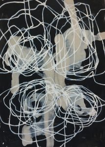 I created paints from mud-stones and rocks collected along the Somerset Coast. Making videos of rocks, studying geological slides, drawing with seagull feathers, sieving, pouring and draining mud; all jostled together in the process of creating these unpredictable and fluid paintings.