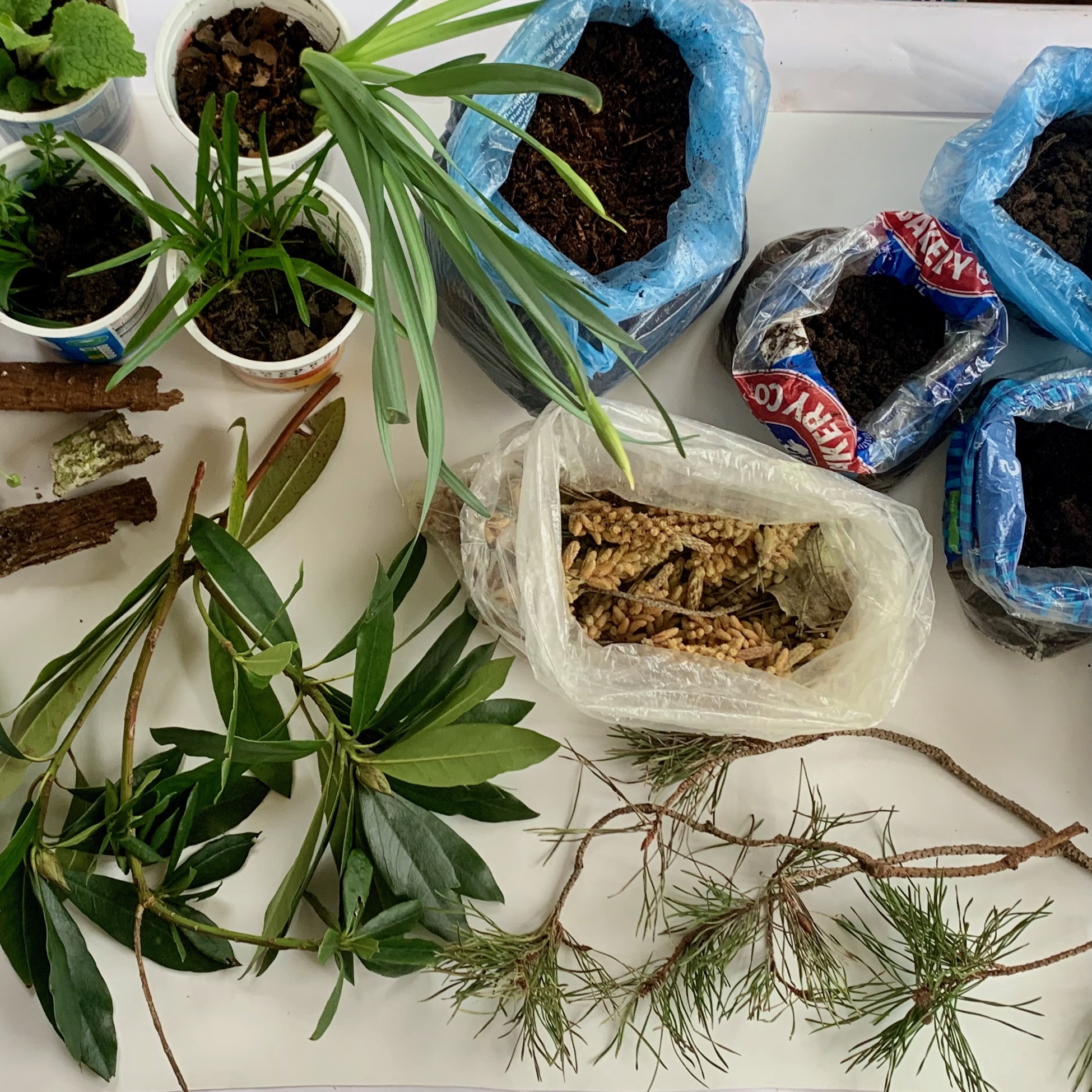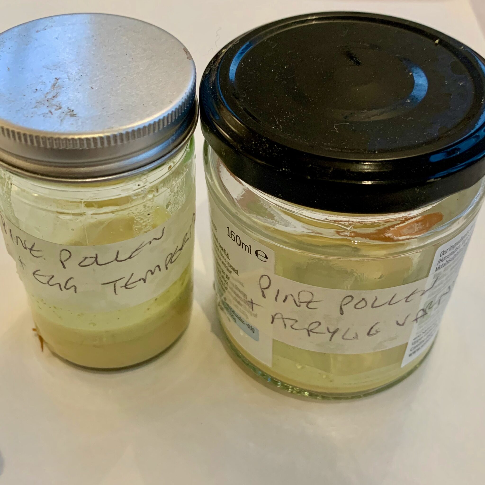 ‘Tree Houses I – IV’ are individual portraits of some of the plantation trees, created using natural pigment paints made from earth samples collected on site. During visits in March, an abundance of yellow Scot’s pine pollen coated the ground beneath the trees and characterised the woodland for that seasonal moment. The collection of wild earth pigments (both earths and pollen) connects simultaneously with the deep history and constantly evolving ‘placeness’ of the plantation and the transient colour and seasonality of the trees and woodland plants.